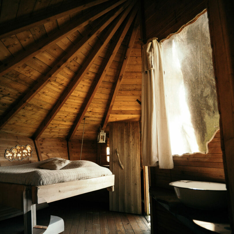 The Baron Perché treehouse consists of two treehouses with terraces, connected by a sturdy wooden footbridge. The first cabin is perched 7 meters above the ground, with a terrace 2 meters higher; the second sits at 10 meters. Each cabin offers 3 beds: a double bed and a single bed. After a 20-minute walk through century-old alleys and forest paths, you’ll arrive at the forest’s edge, where the elevated terraces serve as true observation decks for nature and photography lovers.