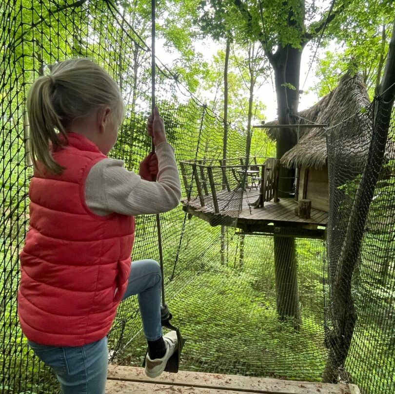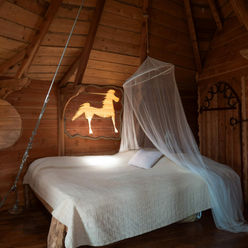 The « fer à cheval » cabin charms with its equestrian spirit. From the moment you arrive, you’ll need to put your foot in the stirrup to cross a short zipline. Perched in an old beech tree, 6 meters above the ground, it features a spacious terrace—perfect for dining in the heart of nature.