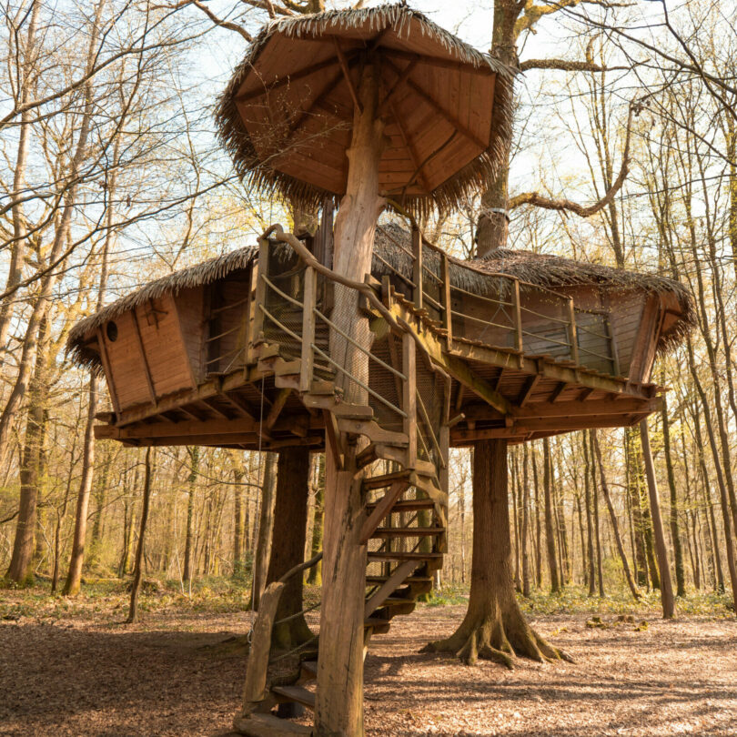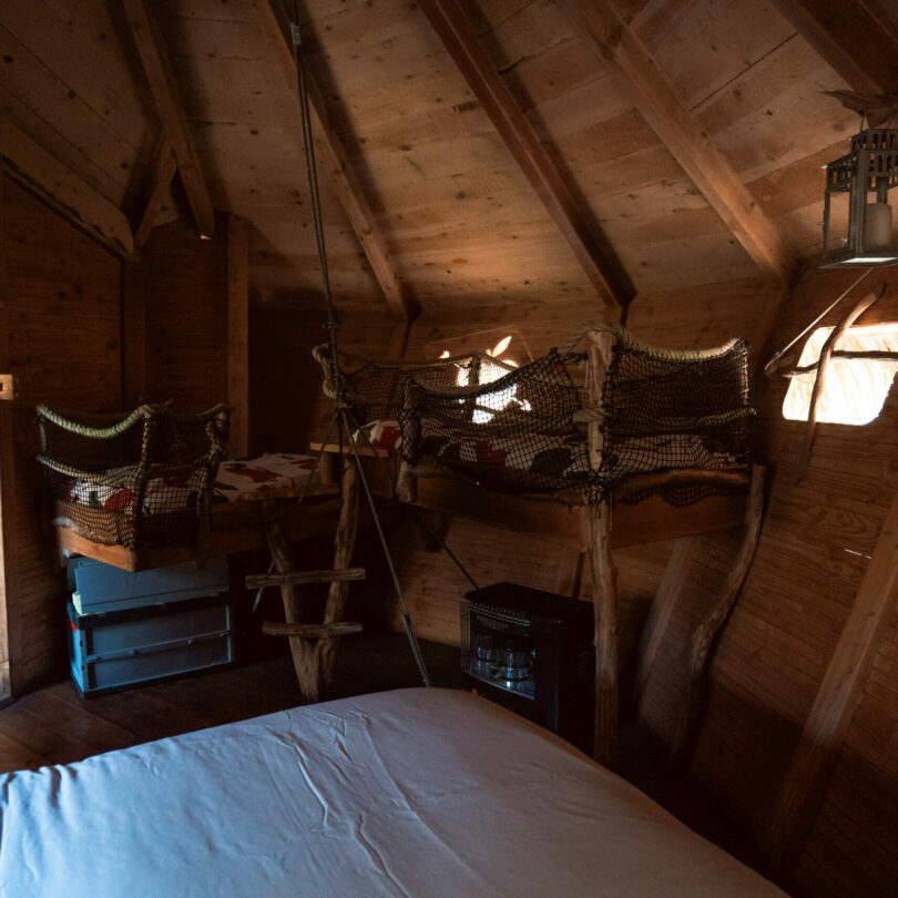 The Robin des Bois cabin is perfect for large families. It can host up to 6 people and 2 young children. It features two huts connected by a covered canopy with a large table—ideal for unforgettable evenings. The cabins are supported by two twin oak trees that literally grow through the huts: you’ll experience the life of a tree, from water trickling down the bark on rainy days to the creaking of branches in the breeze.